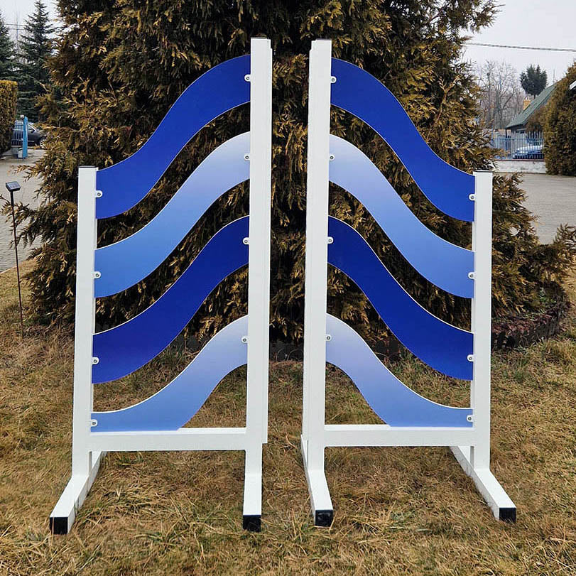 These Wave Show Jump Stands are perfect for professional tournament show jumping. Construction made of aluminium and modern graphic panels makes them not only visually attractive but durable, and easy to move and store. The double powder coated aluminium and laminated surface provides long-lasting weather-resistance.